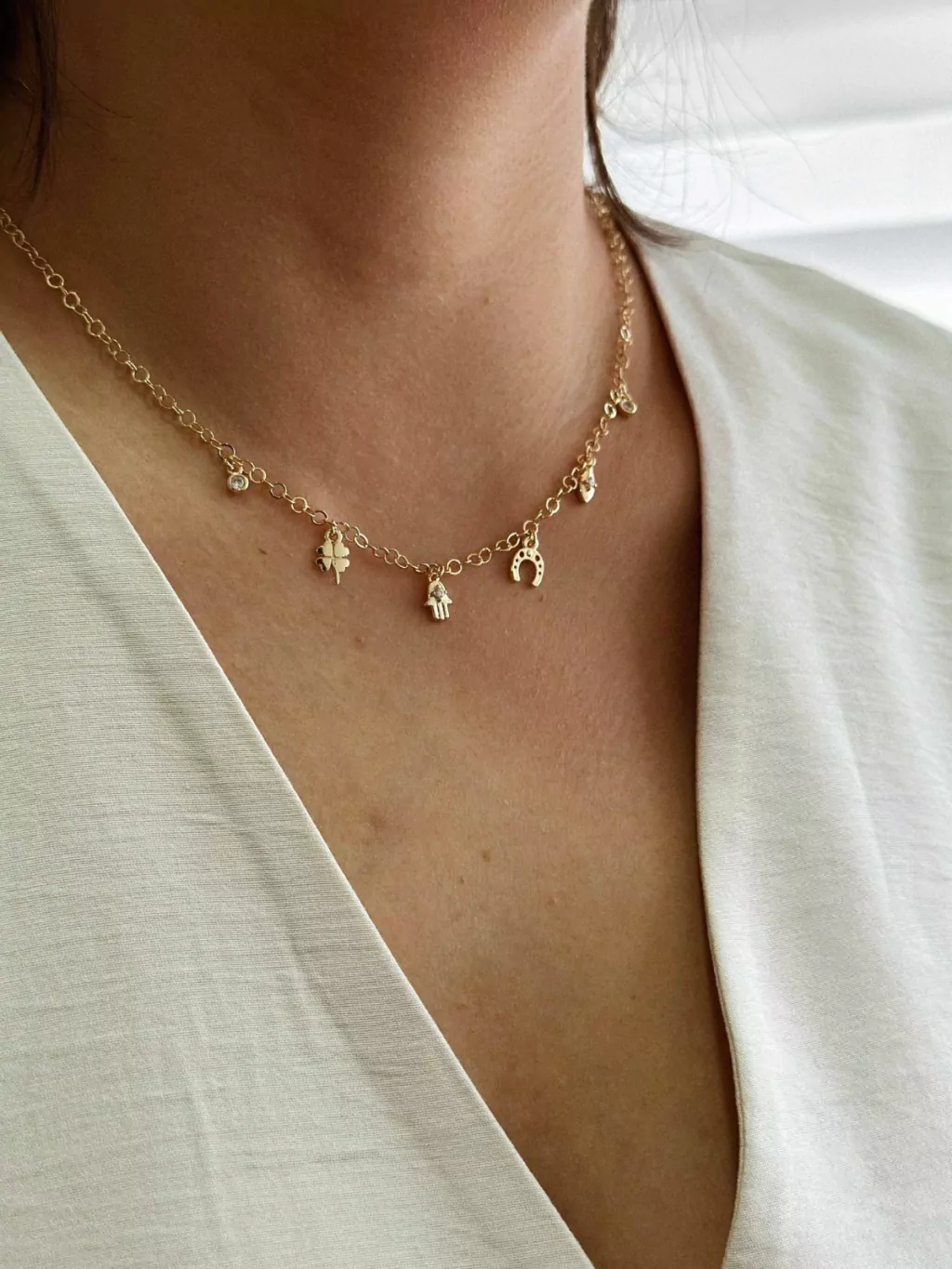 A Choker Amuletos possui pingentes carregados de significado, perfeitos para usar no dia a dia não só como forma de proteção e boa sorte, mas também uma ótima opção para presentear.