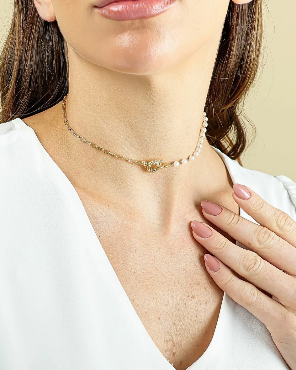 Choker Corrente de Elos e Pérolas - Dourado - Banho de Ouro 18K